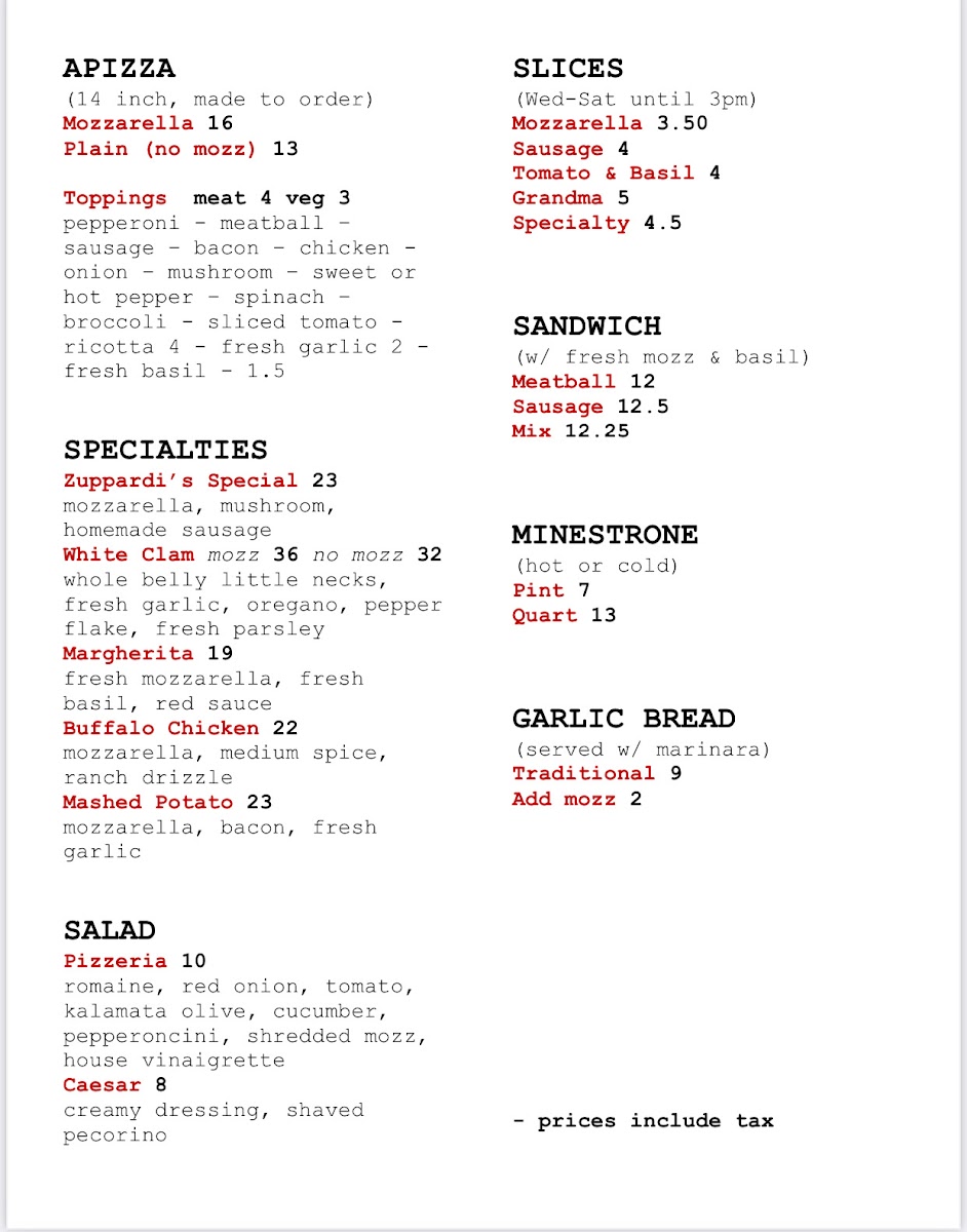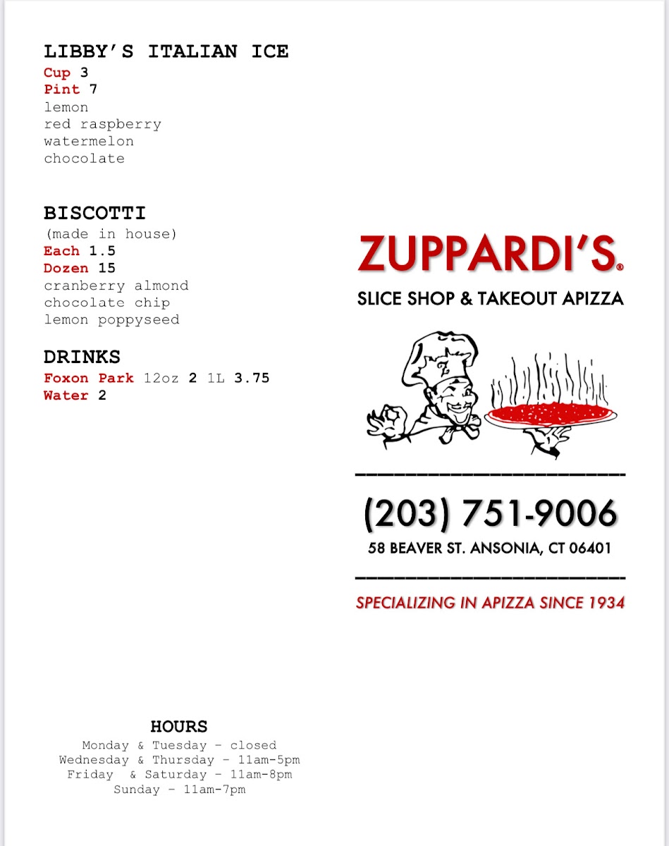 Introducing the menu at Zuppardi's - Slice Shop & Takeout Apizza, a delightful addition to Ansonia’s vibrant pizza scene. Located at 58 Beaver St, this establishment is already making waves with its exceptional offerings. Diners rave about the airy, fluffy crust that maintains a perfect char, a testament to its coal oven roots.